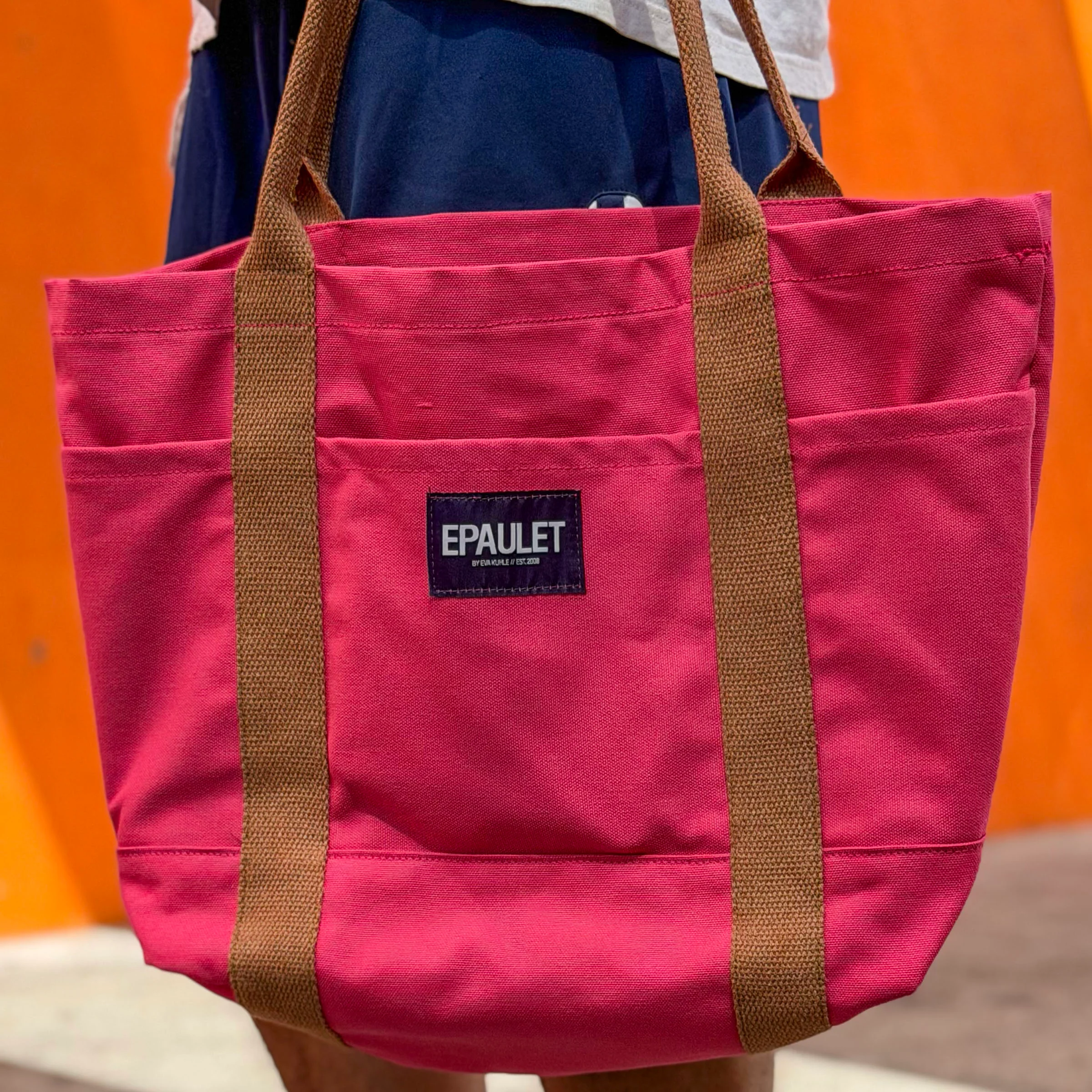 The body is crafted of 11oz American duck canvas, sourced from the legendary Mount Vernon Mill. Their typical pink is a light bubblegum tone. This is a darker and richer flamingo pink, and it's absolutely stunning! This cloth was special-dyed for one of their larger clients, and I bought the remaining inventory. We had enough to make 10 bags in total.