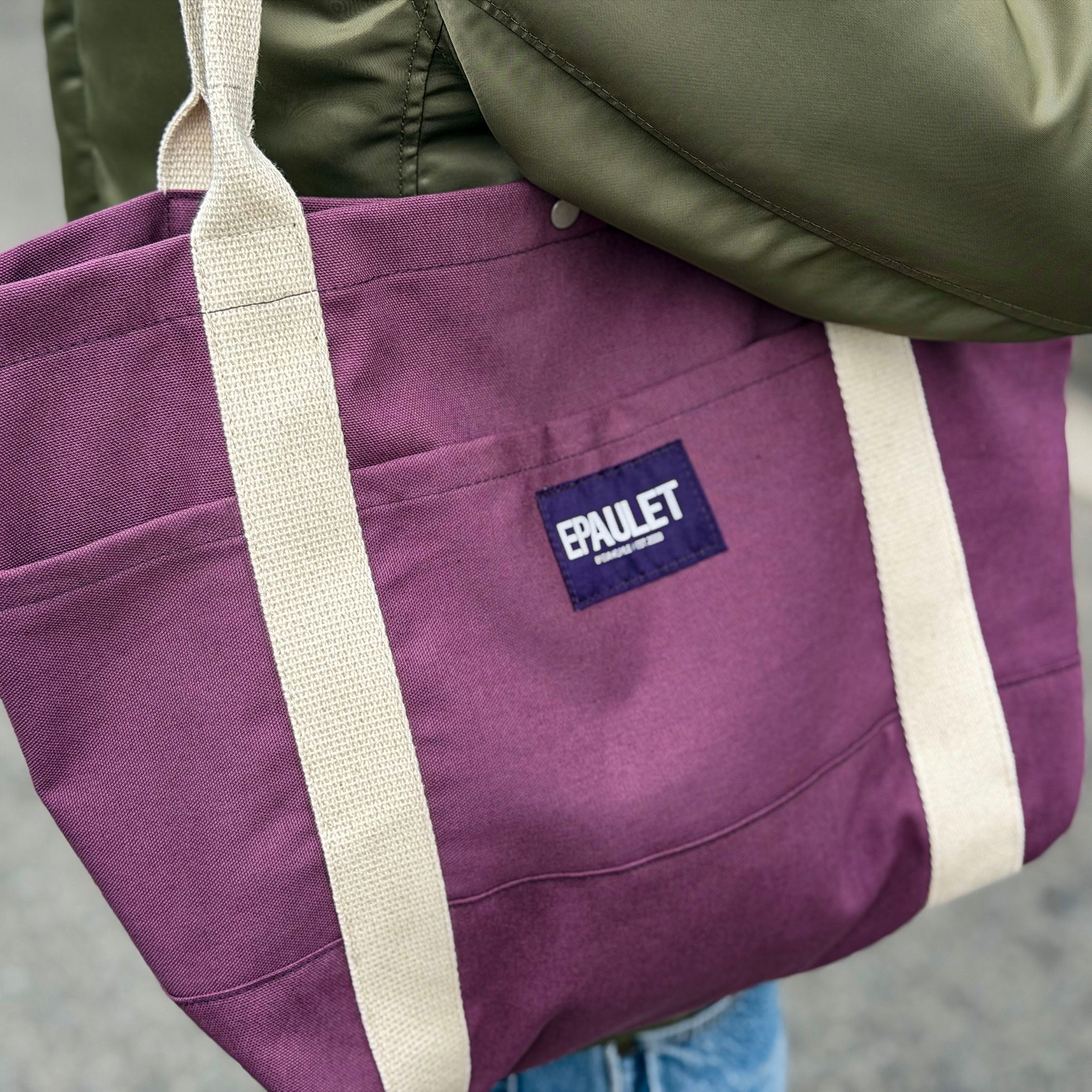 Natural webbing straps provide a bright contrast, and our purple Epaulet label is on the exterior. This bag is fully machine washable.